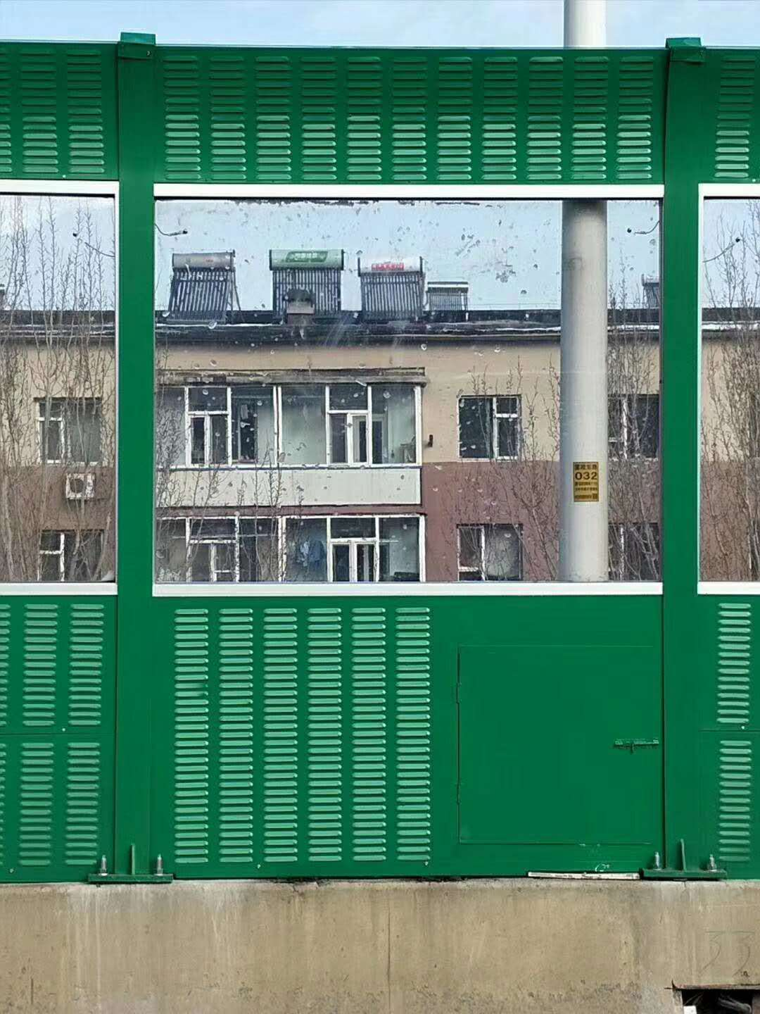 2、 由立柱鋼梁等鋼結構及屏體四邊透光的隔聲板材構成,隔聲屏障的頂部設計成拱形,兩旁設計為聳立式,外部景觀于隔聲屏障內(nèi)可視。