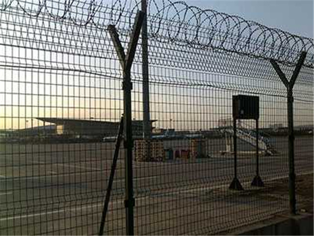 注:機(jī)場(chǎng)護(hù)欄網(wǎng)隔離柵頂部加設(shè)帶刺鐵絲和帶刺鋼絲繩..機(jī)場(chǎng)護(hù)欄網(wǎng)隔離柵。