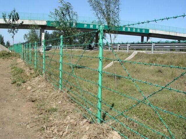 刺鐵絲隔離柵在公路地界線以內(nèi)30cm處設(shè)置,普通路段采用刺鋼絲,并根據(jù)生長環(huán)境和條件配合使用掛草或綠籬,互通區(qū)、服務(wù)區(qū)采用焊接網(wǎng),全線隔離柵應(yīng)進行全封閉布設(shè),在遇到橋梁通道或天然障礙物時應(yīng)斷開封死,不應(yīng)留有人、畜進入的空隙,如遇到小涵洞或小障礙物時隔離柵應(yīng)直接跨過。本項目設(shè)計中采用了鍍鋅焊接網(wǎng)和刺鋼絲網(wǎng)相配合使用的形式,在互通區(qū)和服務(wù)區(qū)前后一定范圍采用鍍塑焊接網(wǎng),在其他路段采用刺鋼絲網(wǎng)。