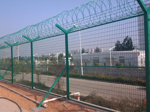 Y型立柱防護(hù)網(wǎng)由于在頂端使用V型支架而得名;近些年來通常在機(jī)場(chǎng)、監(jiān)獄、軍事重地等地使用,為了更好的提高防護(hù)性能,都會(huì)在網(wǎng)片中添加加強(qiáng)型焊接網(wǎng)片以及防盜連接裝置,V型支架則是為了放置刀片刺繩,在頂端安裝刀片刺繩可防止不法人員攀登,還可以通電防護(hù)性能更強(qiáng),不過通電請(qǐng)作出提示,以免出現(xiàn)意外事故。