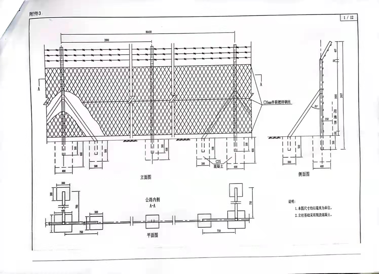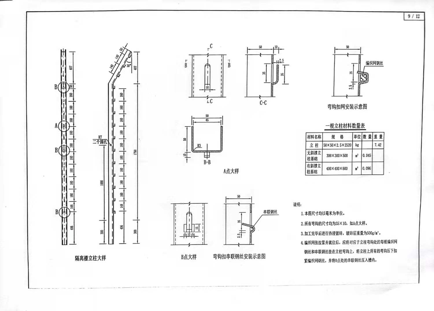 編織網隔離柵的所有金屬部件,均采用熱鍍鋅防腐處理。立柱、斜撐的鍍鋅量為500g/m2,緊固件、連接件的鍍鋅量為350g/m2,隔離柵鋼絲的鍍鋅量為135g/m2。