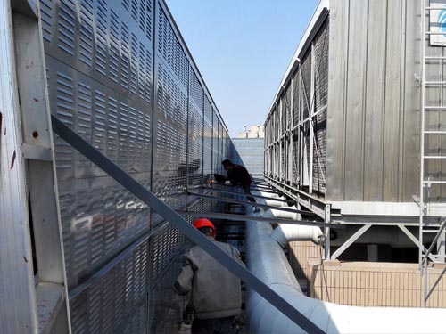 冷卻塔聲屏障聲屏障采用混合型聲屏障,頂部為吸聲單元,以下部分為隔聲單元。合理確定聲屏障的長度和高度后,可獲得10-25dB(A)的降噪量。