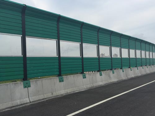 凹凸穿孔聲屏障的減噪量與噪聲的頻率、屏障的高度以及聲源與接收點(diǎn)之間的距離等因素有關(guān)。金屬聲屏障的減噪效果與噪聲的頻率成分關(guān)系很大,對(duì)大于2000Hz的高頻聲比800一1000Hz左右的中頻聲的減噪效果要好,但對(duì)于25Hz左右的低頻聲.則由于聲波波長(zhǎng)而很容易從屏障上方繞射過(guò)去,所以效果就差。通常,金屬聲屏障對(duì)高頻聲可降低l0—15dB。凹凸穿孔聲屏障的高度,可根據(jù)聲源與接收點(diǎn)之間的距離設(shè)計(jì),金屬屏障的高度增加一倍,則其減噪量可增加6dB,為了使金屬屏障的減噪效果好,應(yīng)盡量使金屬屏障靠近聲源或接收點(diǎn)。